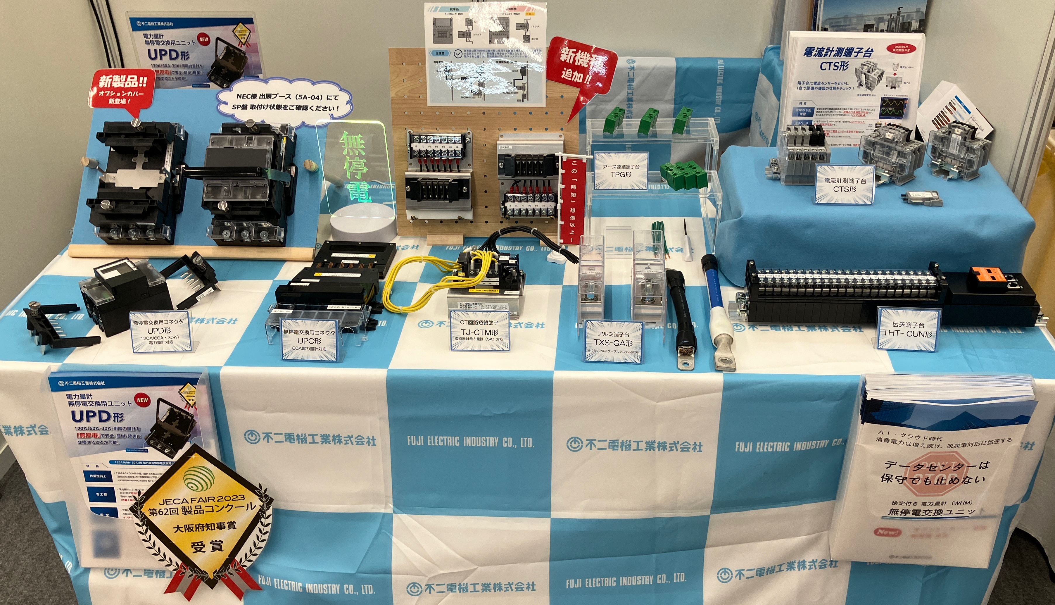 | 主な展示製品 | 無停電交換ユニット:UPD形、 TJ-CTM形、 UPC形 電流計測端子台 :CTS形(新製品) 伝送端子台 :THT-CUN形 通信IFユニット :デジタル変電所/IEC 61850(※開発中) <無停電交換ユニット> ![]() |